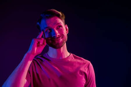 Portrait of attractive sly creative minded guy touching temple thinking copy space isolated over dark neon light violet color background