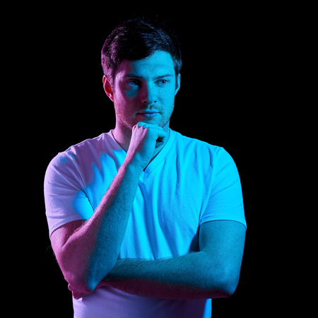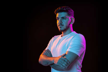 Young mans portrait on black studio background in neon light. Concept of human emotions, facial expression, youth, sales, ad.