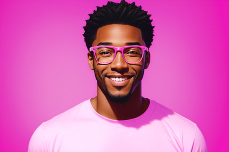 Portrait of a smiling african american man with afro hairstyle wearing pink glasses.
