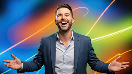 A man smiles broadly with open arms against a vibrant, multi-colored background. The image features a bright, inviting style with dynamic lines and gradients of blue, orange, and green hues. This visual could be suitable for various commercial or editorial applications.