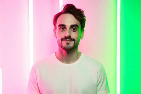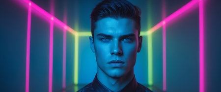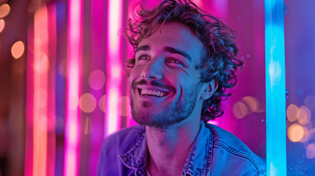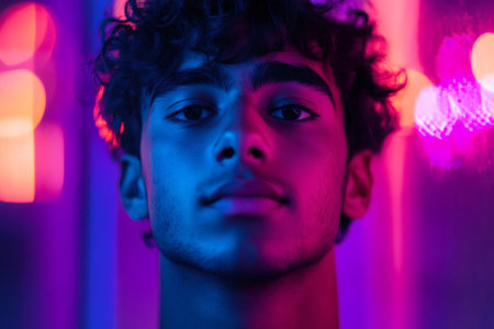 Portrait of a young man with curly hair illuminated by vibrant, colorful neon lights, creating a modern and stylish atmosphere