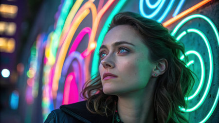 A captivating portrait of a woman with piercing green eyes her expression serious yet thoughtful set against a vibrant kaleidoscope of swirling neon colors. The patterns pulse with.