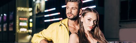 panoramic shot of handsome boyfriend and attractive girlfriend in jacket in night city