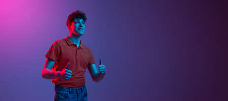 Portrait of smiling young guy in casual clothes posing against gradient purple background in neon light. Success