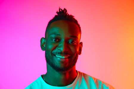 Portrait with smiling african man looking at camera over gradient colorful background in neon. Concept of beauty, youht, emotions, health, fashion, ad,