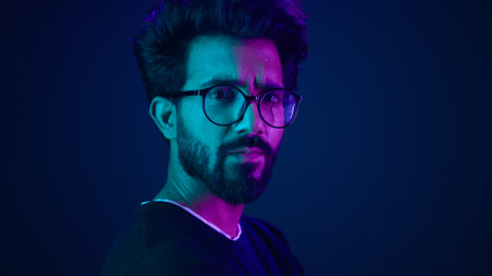 Indian man guy profile turning head looking camera serious developer coding internet technology hacker programmer Arabian male in glasses neon blue ultraviolet studio background high-tech cyberspace