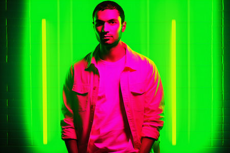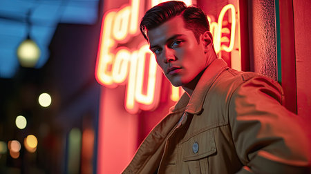 A striking portrait of a young man against vibrant neon lights in an urban setting, capturing a modern and stylish essence during nighttime.