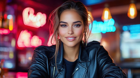 A confident woman with bold makeup smiling in vibrant bar setting