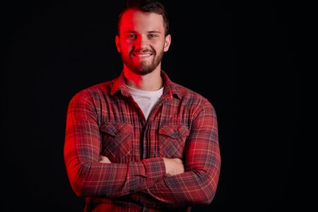 Handsome smiling guy of caucasian appearance stand open-mindly smiling, look at camera. Isolated over black background, red neon light reflected on man