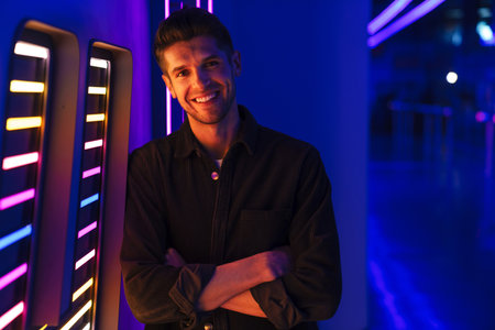 Portrait of handsome young man smiling at camera while standing in nightclub