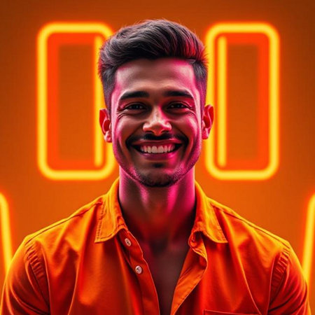 Handsome young man in orange shirt on orange background with neon lights.