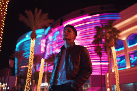 A young adult Hispanic man stands with confidence outside a luxurious Las Vegas casino, illuminated by neon lights. The bustling atmosphere of nightlife, palm trees, and modern architecture creates an electrifying backdrop.