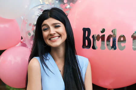 Young beautiful brunette bride to be with dark hair and silver crown smiling on bachelorette party balloon background