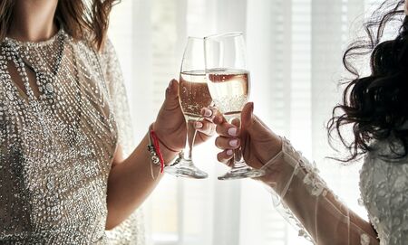 Cheers! Photo bride with her friends drinking champagne from glasses