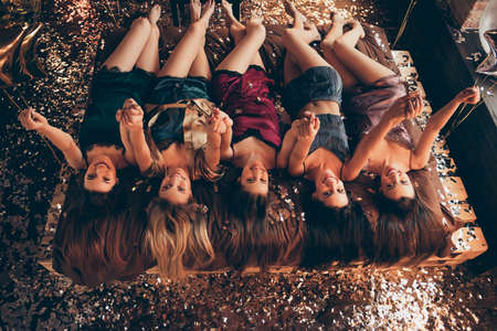 Fashion beauty festive hold hands feminine feminism power concept. Top above high angle view photo of five excited carefree attractive lovely slim pretty diverse ladies lying down sheets linen