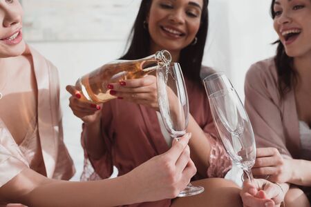 Partial view of african american girl pouring champagne in glasses with friends at bachelorette party