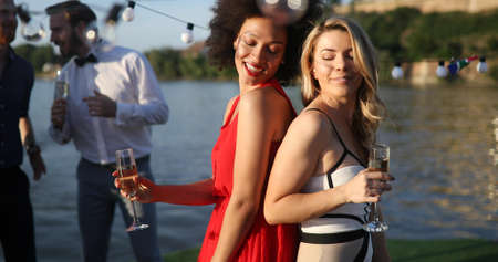 Group of stylish happy females gathering in summer for party and enjoying time together drinking white wine