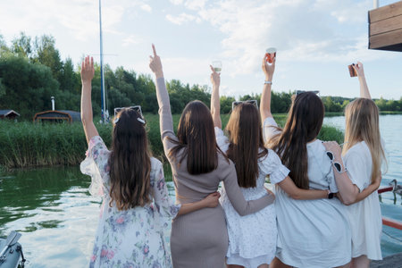 Five close friends gather at a lakeside, joyfully raising their drinks in cheers of friendship on a beautiful evening