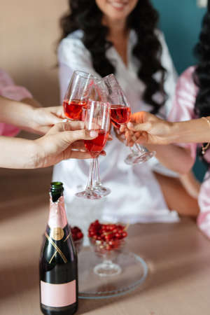 Close up photo five beautiful engagement event she her hang out ladies fellows hands arms raise glasses golden beverage short nightie sit sheets clink tell talk toasts sleep costumes room indoors