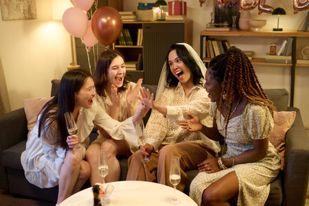 Group of four young women, including Caucasian and Black, sitting on sofa celebrating bachelorette party, bride showing engagement ring, friends laughing and holding champagne glasses