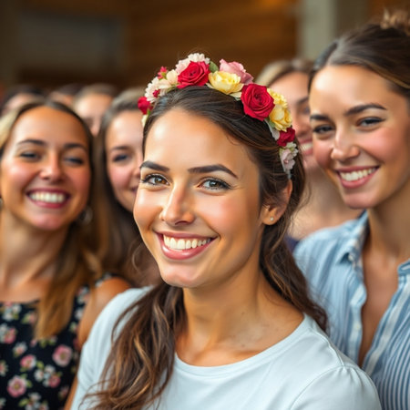 Friends gather in a lively atmosphere adorned with colorful flowers, enjoying each other's company and sharing joyful laughter during a special celebration event.