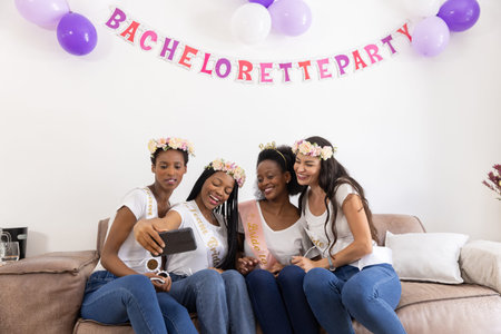 Diverse female friends taking smartphone selfie on sofa at home under bachelorette party banner. Celebration, friendship, joy, unity, candid, festive, diversity