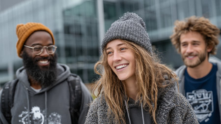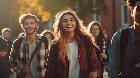 Young adults enjoying outdoor campus life, expressing joy, togetherness, and friendship.