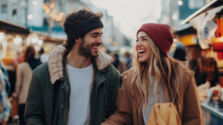 Couple enjoying a winter market stroll, sharing laughter and warmth amidst festive decorations on a chilly afternoon