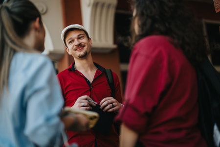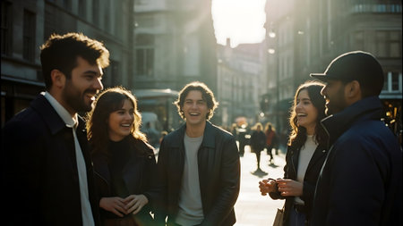 Young friends socializing outdoors in a vibrant sunny autumn urban setting