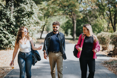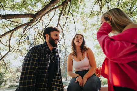 Friends having fun and socializing on a sunny day in a city park, enjoying nature and green environment.