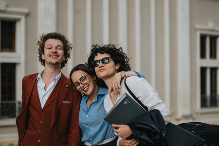 Three happy friends posing together and smiling outdoors in front of a building