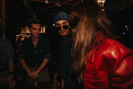 Friends gather at a dimly lit night out bar with drinks and stylish outfits