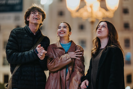 Friends enjoy a night out outdoors beneath warm streetlights, smiling and together