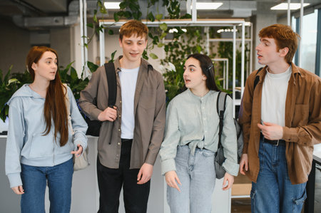 Four cheerful students with backpacks are walking and chatting together in a modern university corridor