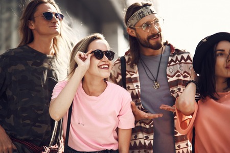 Group of young people walking in the city. People having fun outdoors.