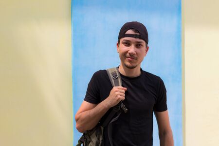 Young student against the background of the wall of an educational institution. Concept back to university
