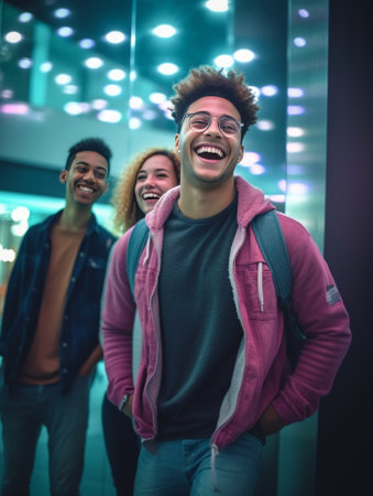 Three cheerful young adults bonding and laughing together in a bustling indoor setting