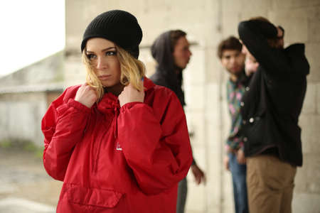 Hispanic female young adult listening with multiethnic friends outdoor in urban city style