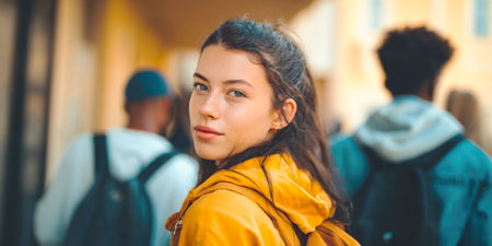 A captivating portrait of a young woman with a direct gaze, looking back over her shoulder with an urban background, reflecting a sense of individuality and modern style.