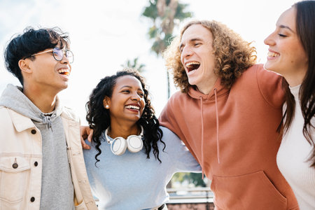 Group of diverse friends laughing and enjoying a sunny day in the park