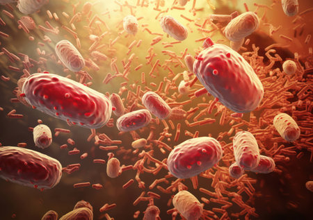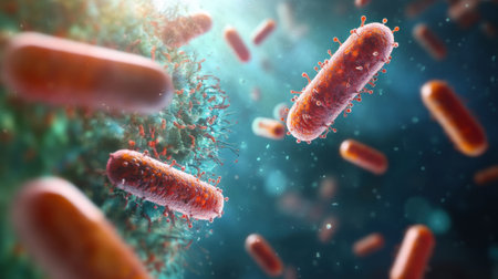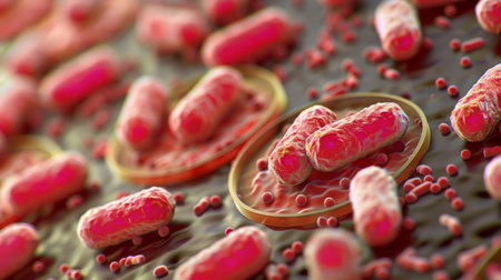 A highly detailed microscopic view of bacteria, representing microbiology, infections, science, biotechnology, disease research, and microbial life in healthcare