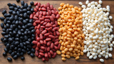 Assorted beans on rustic wooden table