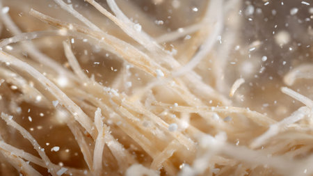 Close-up of delicate mycelium threads with white spots, showcasing the intricate beauty of fungal growth in detail.