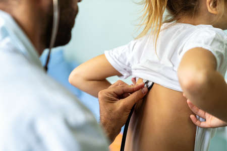 Doctor examining little girl with stethoscope in hospital. Healthcare, child, pediatrician concept.