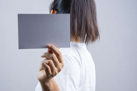 Woman hand hold blank photo paper card on grey background