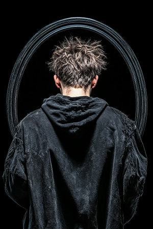 Man with messy hair in circular frame, dark graphic style, on black background, concept of mystery