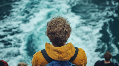 A man with curly hair is wearing a yellow jacket and looking out over the ocean