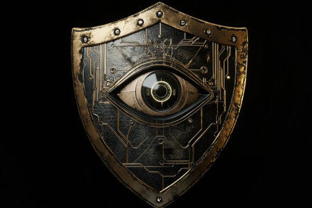The shield displays intricate cybernetic patterns and a central robotic eye, embodying the fusion of technology and security in the digital age.