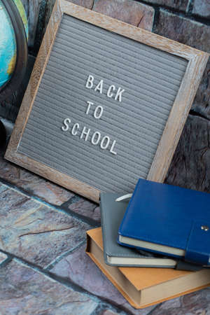 Back to school concept. School supplies on wooden background. Back to school lettering on white letter board. Copy space for text. Selective focus included