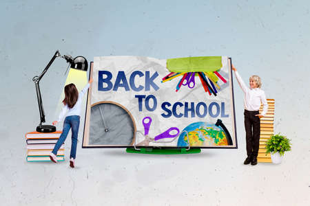 Exclusive painting magazine sketch image of little children kids looking back to school placard isolated painting background